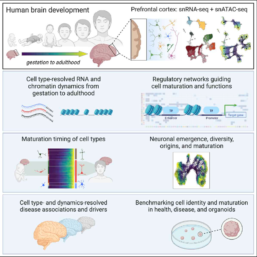 Key findings include a detailed transcriptome reference for human brain development, highlighting the dynamics of gene expression in cell-type specificity during PFC development and its implications for disorders like major depressive disorder (MDD). The research navigates through statistical and computational analyses to map cellular differentiation, gene regulatory mechanisms, and the association of certain cell types with neuropsychiatric conditions. Despite facing limitations such as sample size variability, the study provides significant insights into the timing, patterns, and genetic underpinnings of PFC development, marking a crucial step towards understanding the brain's complex biology and its relation to mental health.