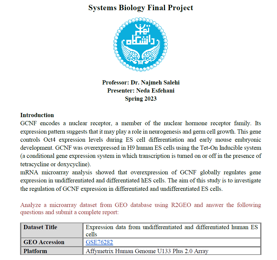 The Systems Biology Final Project, investigates the impact of GCNF gene overexpression on human embryonic stem cell differentiation. Leveraging the GEO database and R2GEO for data analysis, the study categorizes embryonic stem cells into undifferentiated and differentiated groups, identifying critical differentially expressed genes (DEGs) with specific thresholds. Techniques like UMAP and Venn diagrams were utilized to reveal DEGs clustering and their biological pathway overlaps, enhancing our understanding of cellular processes involved.